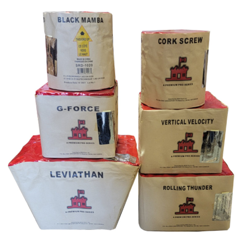 6 pre-selected Pro Series cakes, with 158 shots from crackling effects, to whistling, to huge bursts of colour.